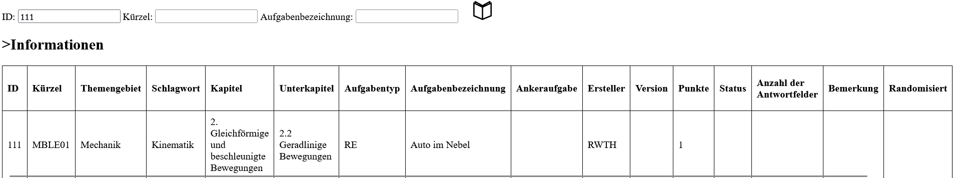 Die Metadaten der Stackaufgaben sind in Form einer Tabelle organisiert. Diese Metadaten umfassen verschiedene Informationen: ID, Kürzel, Themengebiet, Schlagwort, Kapitel, Unterkapitel, Aufgabentyp, Aufgabenbezeichnung, Ankeraufgabe, Ersteller, Version, Punkte, Status, Anzahl der Antwortfelder, Bemerkung, Randomisiert, Info zur Quelle und ZIP-Datei. Das Kürzel setzt sich aus mehreren Daten zusammen, die durch einen Klick auf das „Informationen“-Feld genauer eingesehen werden können.