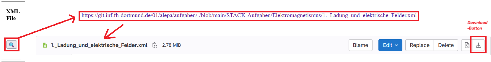 Über „XML-Files“ wird die im GitLab befindliche XML-Datei gesucht, die die angeklickte Aufgabe enthält, und die hierüber heruntergeladen werden kann.